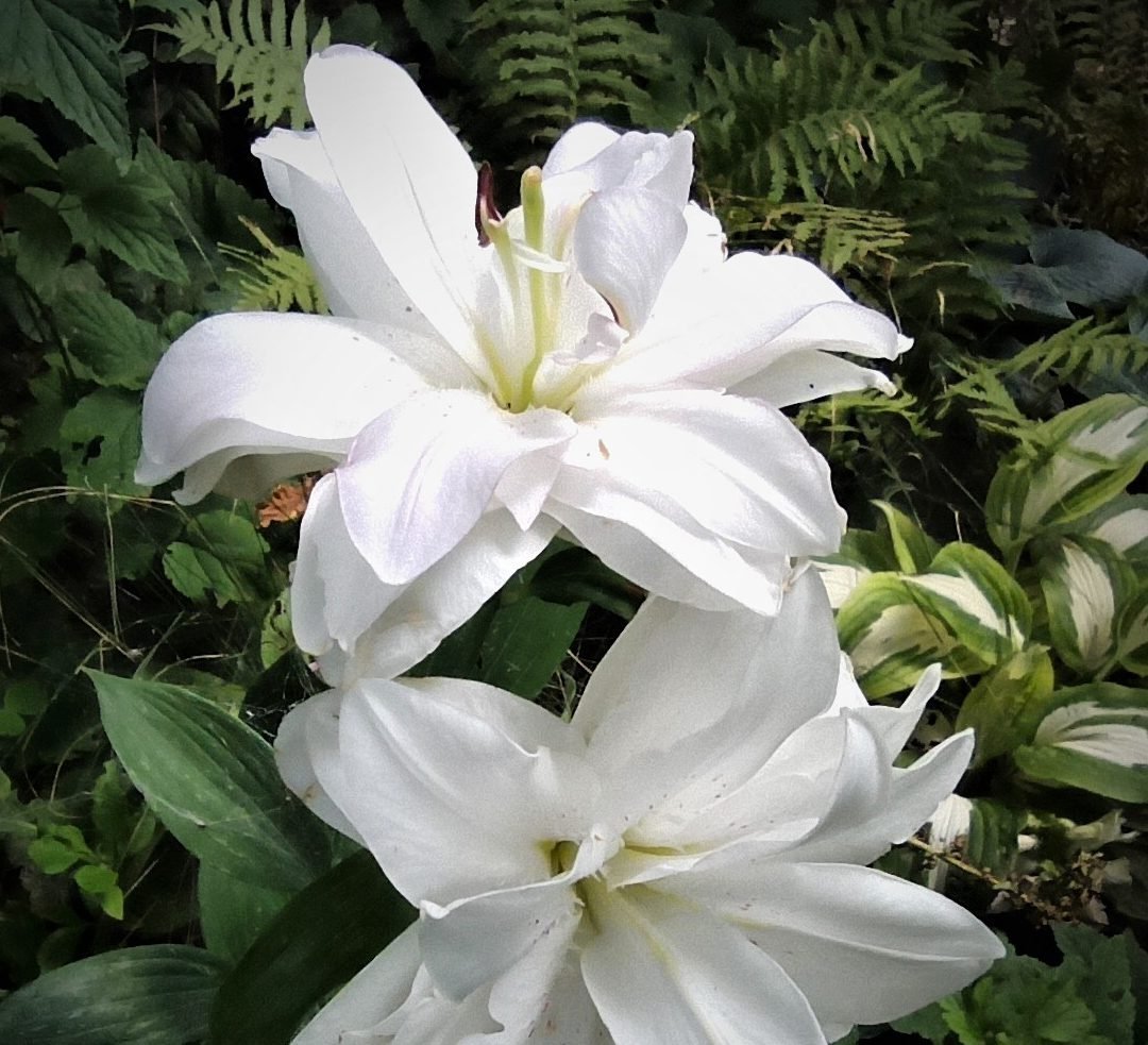 Ljiljani su divni: Brindizi sa jednostavnim ružičastim cvetovima i beli sa cvetovima lotosa . Oni uspevaju na ovom polusenovitom, relativno suvom tlu. Nedelju dana kasnije, procvetale su u svojim pratiocima zasađenim na sunčanom mestu.