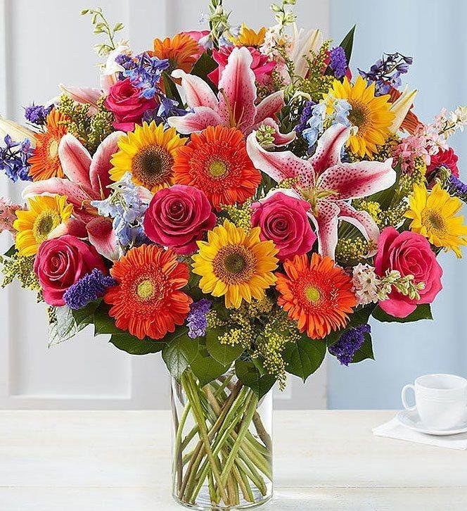 „Letnja Fantazija“ je raskošan buket koji oduzima dah! Spoj razigranih suncokreta, jarko crvenih i narandžastih gerbera, ružičastih ljiljana i baršunastih ruža stvara šareni spektakl pun pozitivne energije i radosti. Ovaj buket je idealan za rođendane, čestitke, proslave i svaki trenutak kada želite da unesete svetlost i osmeh u nečiji dan.
