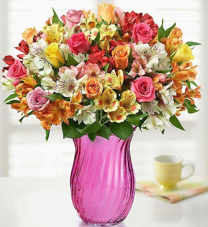 Unesite radost i vedrinu u nečiji dan uz ovaj očaravajući buket u roze staklenoj vazi. Kombinacija ruža i raznobojnih alstromerija odiše svežinom, elegancijom i radošću. Izvrstan odabir za rođendane, zahvalnost, čestitke ili samo da izmamite osmeh na lice dragoj osobi.